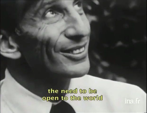 Ivan Illich. Entretien télévisé (en francais, sous-titrage en anglais) avec Jean-Marie Domenach (1972). Capture d'écran (https://vimeo.com/6694847) "Curieux du monde, inquiet du monde, amoureux des hommes et des dieux, Ivan Illich naît à Vienne en 1926 sur la terre d'Europe, fragile et instable. Il lui faut être un peu partout, là où le permet son origine juive. Il apprend huit langues, s'adresse aussi à Dieu et devient prêtre, évêque, puis renonce à la hiérarchie pour être toujours le voyageur en quête de justice et de vie. Comme les cristaux qu'il a aussi étudiés, sa parole est faite de paillettes anguleuses, géométriques où l'histoire, la philosophie et la science éclosent en un apparent désordre avant de prendre forme : des étoiles de pensées.On peut certes croire à d'autres soleils ou révérer des astres morts et les lumières d'Illich peuvent ne paraître que de lointaines nébuleuses. Un certain regard est, ce soir, celui d'un astronome de l'humain."6